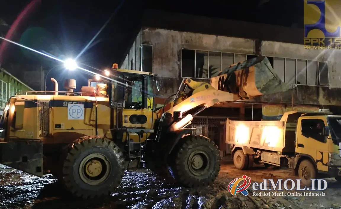 Aceh Tamiang,— RedMOL. ID - Upaya pembersihan pascabanjir bandang dan longsor di Kabupaten Aceh Tamiang terus dikebut. Hingga larut malam, tim penanggulangan bencana dari Kemeterian Pekerjaan Umum (PU) dan relawan mengerahkan alat berat untuk membersihkan material sisa banjir yang menutup jalan nasional.