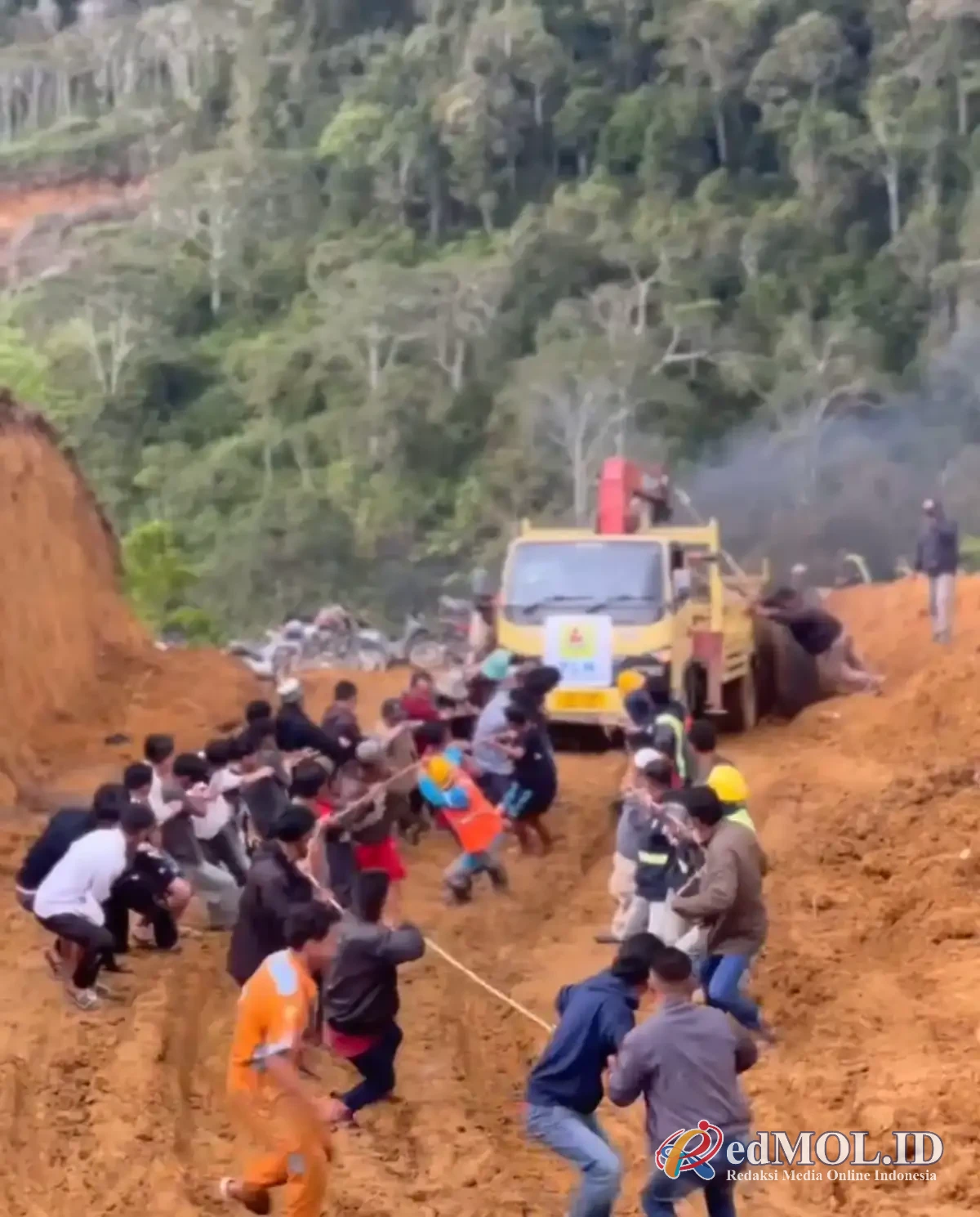 Aksi tersebut terekam dalam sebuah video yang diterima, Minggu (28/12). Dalam video itu terlihat lebih dari 50 warga bergotong royong menarik truk Unit Layanan Pelanggan (ULP) PLN Takengon yang membawa material perbaikan kelistrikan. Truk tersebut melintas di jalan tanah yang dipenuhi material longsor.