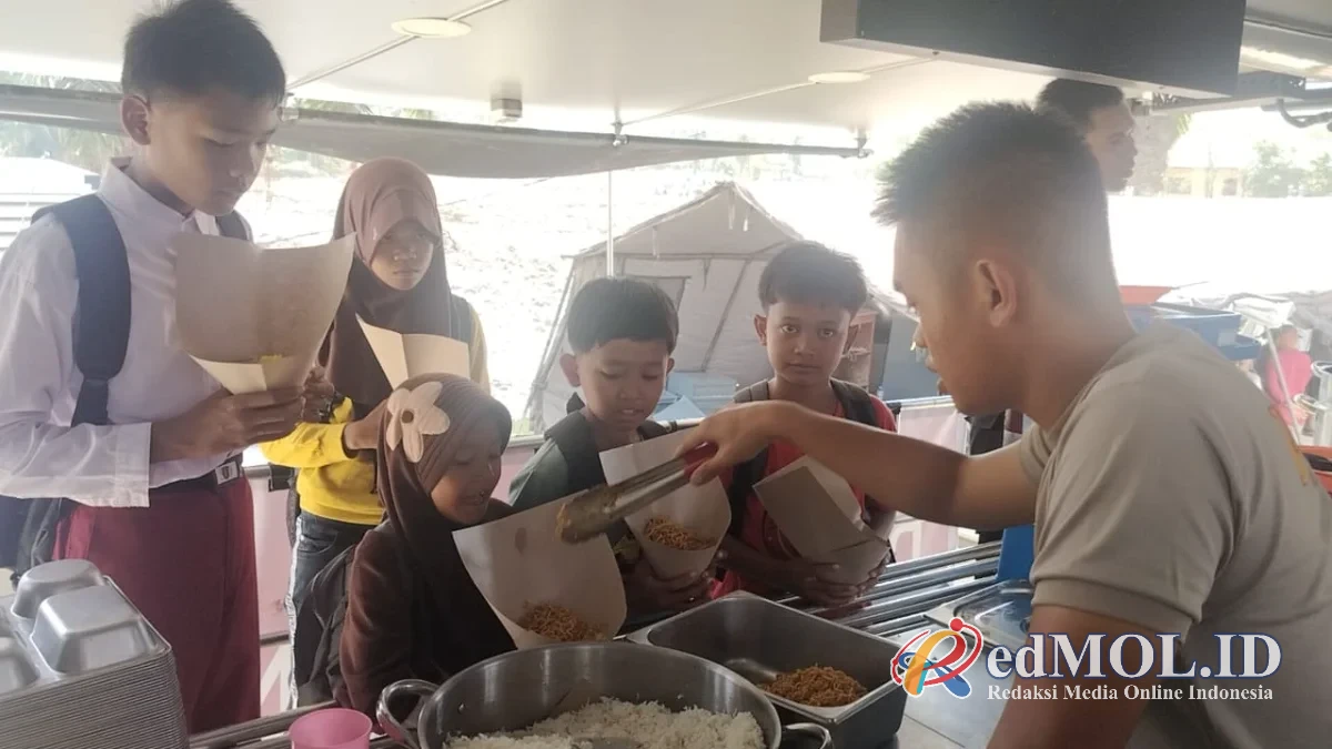 Di dapur lapangan Posko Pengungsian Samsat Aceh Tamiang, suasana humanis tampak saat seorang anggota Polri melayani lima siswa yang mengantre sambil membawa nasi dalam bungkusan terbuka. Anggota tersebut dengan sabar membagikan lauk makanan kepada para siswa yang terdampak bencana.